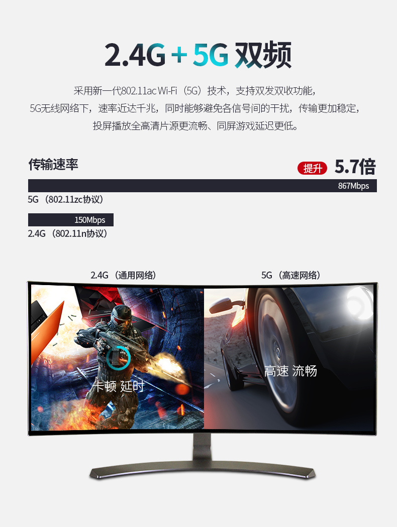 - 2.4G+ 5G 模式,双模技术