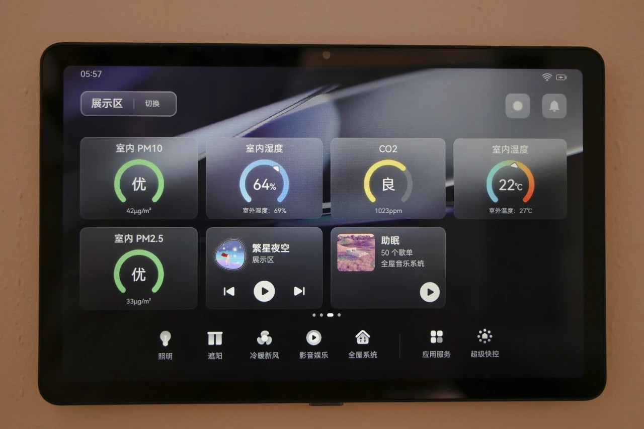 新风门、墙、柜一体化接入鸿蒙智家生态,构建“会呼吸的家”。百得胜展厅化身“空气实验室”,手机一键切换通风模式,用数据可视化呈现温度,湿度,甲醛,PM2.5,CO2,TVOC并自控净化效率,让健康呼吸看得见。